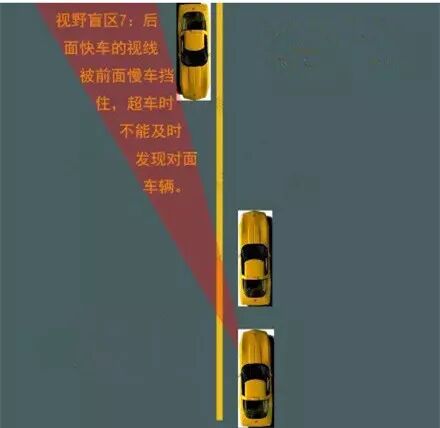 视野盲区7:后车快、前车慢时,后车视线被前车挡住,超车时不能及时发现对面车辆。